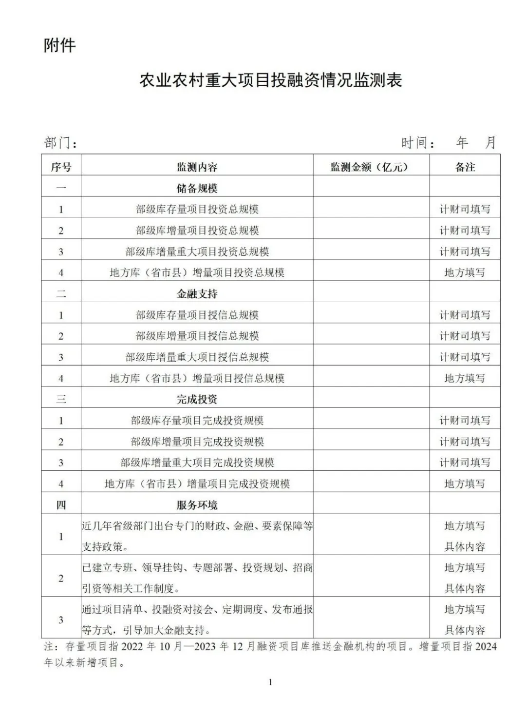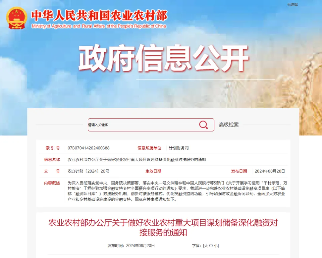 農(nóng)業(yè)農(nóng)村部辦公廳關(guān)于做好農(nóng)業(yè)農(nóng)村重大項(xiàng)目謀劃儲備深化融資對接服務(wù)的通知為深入貫徹落實(shí)黨中央、國務(wù)院決策部署,落實(shí)中央一號文件精神和中國人民銀行等5部門《關(guān)于開展學(xué)習(xí)運(yùn)用“千村示范、萬村整治”工程經(jīng)驗(yàn)加強(qiáng)金融支持鄉(xiāng)村全面振興專項(xiàng)行動(dòng)的通知》要求,我部進(jìn)一步完善農(nóng)業(yè)農(nóng)村基礎(chǔ)設(shè)施融資項(xiàng)目庫(以下簡稱“融資項(xiàng)目庫”)對接服務(wù)機(jī)制,創(chuàng)新對接服務(wù)模式,優(yōu)化投融資監(jiān)測功能,引導(dǎo)加強(qiáng)財(cái)政金融協(xié)同聯(lián)動(dòng),全面加大對農(nóng)業(yè)產(chǎn)業(yè)和鄉(xiāng)村基礎(chǔ)設(shè)施建設(shè)的金融支持?,F(xiàn)就有關(guān)事項(xiàng)通知如下。