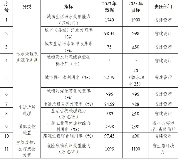 污水處理及資源化利用。到2025年,全省城鎮(zhèn)生活污水處理能力達(dá)到1900萬(wàn)噸/日,全省城市(縣城)污水處理率達(dá)到98%以上,城市生活污水集中收集率力爭(zhēng)達(dá)到80%以上;進(jìn)水五日生化需氧量(BOD5)濃度高于100毫克/升的城市污水處理廠規(guī)模占比達(dá)到90%以上或較2022年提高5個(gè)百分點(diǎn);打造5個(gè)以上城鎮(zhèn)污水處理綠色低碳標(biāo)桿廠;全面完成接入城鎮(zhèn)污水處理廠的市政污水管網(wǎng)和工業(yè)園區(qū)集中污水處理設(shè)施的配套污水管網(wǎng)(均含提升泵站等附屬設(shè)施)隱患排查工作,有序推進(jìn)問(wèn)題管網(wǎng)提升改造任務(wù);全省各城市再生水利用率不低于20%,其中缺水城市不低于25%。城鎮(zhèn)污泥無(wú)害化處置率不低于95%。