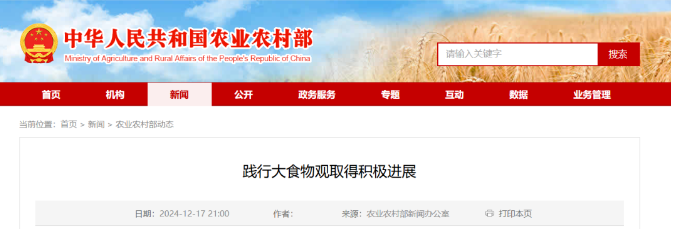 農(nóng)業(yè)農(nóng)村部新聞辦公室于2024年12月17日發(fā)布:《踐行大食物觀取得積極進(jìn)展》。