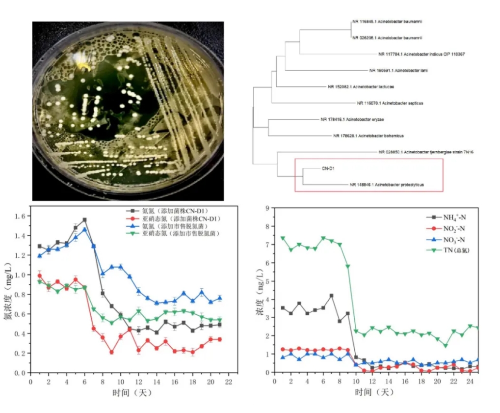 針對上述問題,研究團隊分離并鑒定了一株不動桿菌(Acinetobacter sp.)CN-D1菌株,保藏編號為CCTCC NO:M 20242023。CN-D1是一種同步硝化反硝化菌,能夠同時除去水體中的總氮、氨氮、亞硝酸鹽等物質;同時環(huán)境耐受性強,可以應用于循環(huán)養(yǎng)殖水體和養(yǎng)殖尾水中,發(fā)揮生物脫氮的作用。在實際應用中,循環(huán)水養(yǎng)殖系統(tǒng)中投加CN-D1菌劑后,水體中的氨氮和亞硝態(tài)氮的去除率分別可以達到70.8% 和69.2%。針對尾水中的高濃度污染物(NH4+-N 3.5 mg/L、TN 6.9 mg/L),連續(xù)投加菌劑后10天內,各項指標均大幅下降,穩(wěn)定時的NH4+-N、NO??-N以及TN的去除率分別可以達到86.5%、81.7%和71.0%。總的來說,該研究為我國循環(huán)水養(yǎng)殖系統(tǒng)水處理提供了新的菌種資源,有效減少循環(huán)水養(yǎng)殖系統(tǒng)水處理的成本。