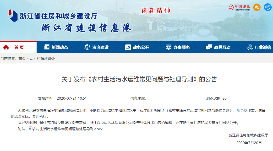 為加強農(nóng)村生活污水治理設(shè)施運行維護管理,改善農(nóng)村人居環(huán)境,切實發(fā)揮縣(市、區(qū))“五位一體”的各方主體作用,規(guī)范縣(市、區(qū))農(nóng)村生活污水治理設(shè)施運行維護各方的管理要求,由浙江省住房和城鄉(xiāng)建設(shè)廳提出,雙良商達等單位參與編寫的《浙江省縣(市、區(qū))農(nóng)村生活污水治理設(shè)施運行維護管理導則》已于2017年發(fā)布。