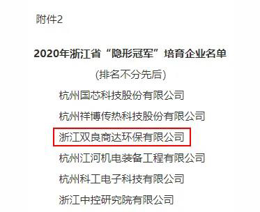 1月14日,浙江省經濟和信息化廳官方公示發(fā)布《關于公布2020年浙江省“隱形冠軍”企業(yè)名單的通知》,公布了2020年浙江省“隱形冠軍”培育企業(yè)名單,浙江雙良商達環(huán)保有限公司入選“隱形冠軍”培育企業(yè)。同時入選的還有浙江中控研究院有限公司、杭州國芯科技股份有限公司、杭州科工電子科技有限公司等企業(yè)。
