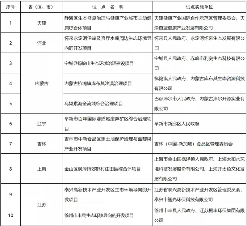 2021年4月,生態(tài)環(huán)境部、發(fā)改委和國開行聯(lián)合印發(fā)《關(guān)于同意開展生態(tài)環(huán)境導(dǎo)向的開發(fā)(EOD)模式試點(diǎn)的通知》,集中梳理天津、河北、內(nèi)蒙古等20個(gè)?。▍^(qū)、市)的36個(gè)典型意義試點(diǎn)項(xiàng)目,主要涉及流域治理、生態(tài)農(nóng)業(yè)、礦山修復(fù)、沙漠治理、“無廢城市”等。