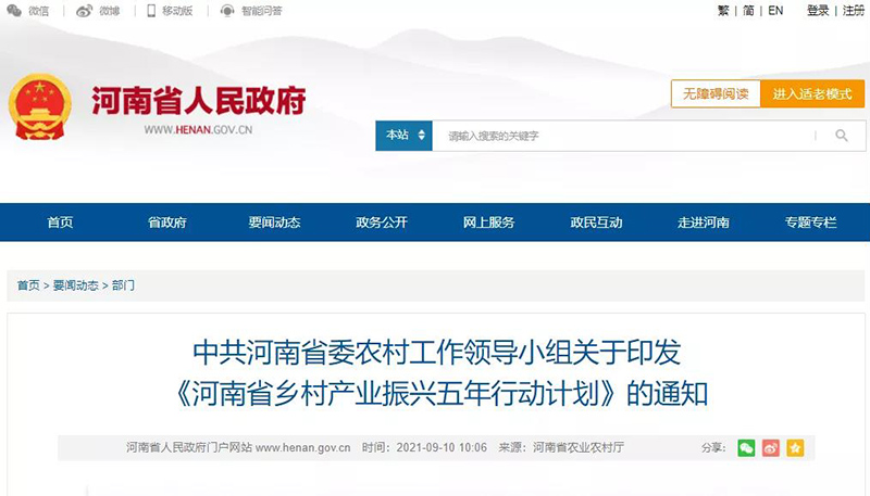 9月3日,中共河南省委農(nóng)村工作領導小組印發(fā)《河南省鄉(xiāng)村產(chǎn)業(yè)振興五年行動計劃》。