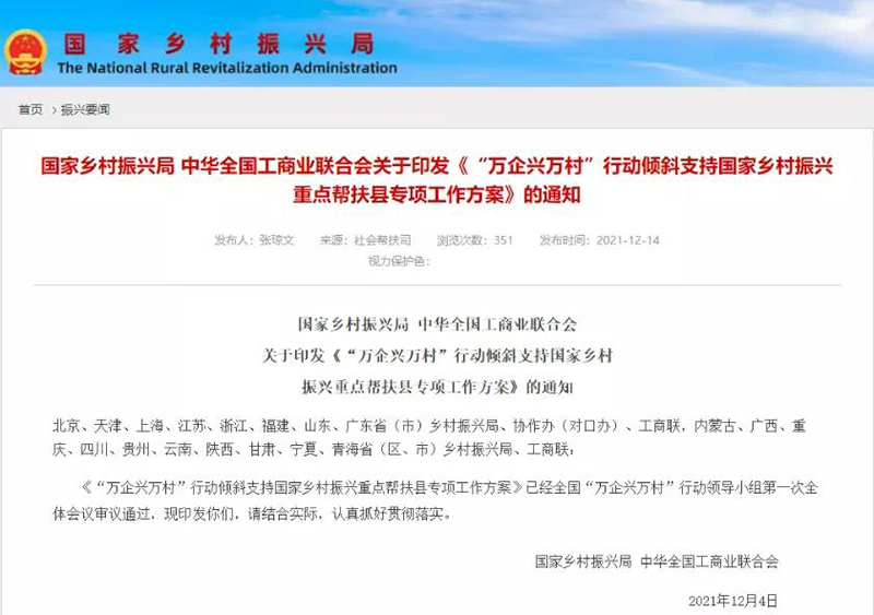 為深入貫徹黨中央、國務院關于傾斜支持國家鄉(xiāng)村振興重點幫扶縣的決策部署,廣泛動員民營企業(yè)助力國家鄉(xiāng)村振興重點幫扶縣鞏固拓展脫貧攻堅成果,銜接推進鄉(xiāng)村振興,按照《中共中央、國務院關于實現(xiàn)鞏固拓展脫貧攻堅成果同鄉(xiāng)村振興有效銜接的意見》總體部署,根據(jù)中共中央辦公廳、國務院辦公廳《關于確定國家鄉(xiāng)村振興重點幫扶縣的意見》和全國工商聯(lián)、農(nóng)業(yè)農(nóng)村部、國家鄉(xiāng)村振興局、中國光彩會、中國農(nóng)業(yè)發(fā)展銀行、中國農(nóng)業(yè)銀行《關于開展“萬企興萬村”行動的實施意見》部署要求,國家鄉(xiāng)村振興局、全國工商聯(lián)聯(lián)合開展“萬企興萬村”行動傾斜支持國家鄉(xiāng)村振興重點幫扶縣(以下簡稱“重點幫扶縣”)專項工作。