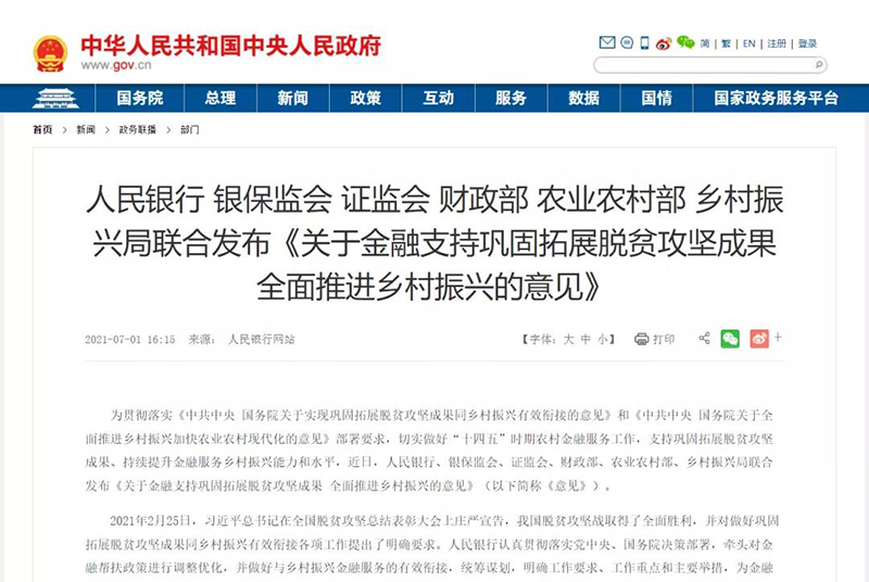 中國人民銀行等六部門聯(lián)合發(fā)布了《關于金融支持鞏固拓展脫貧攻堅成果 全面推進鄉(xiāng)村振興的意見》