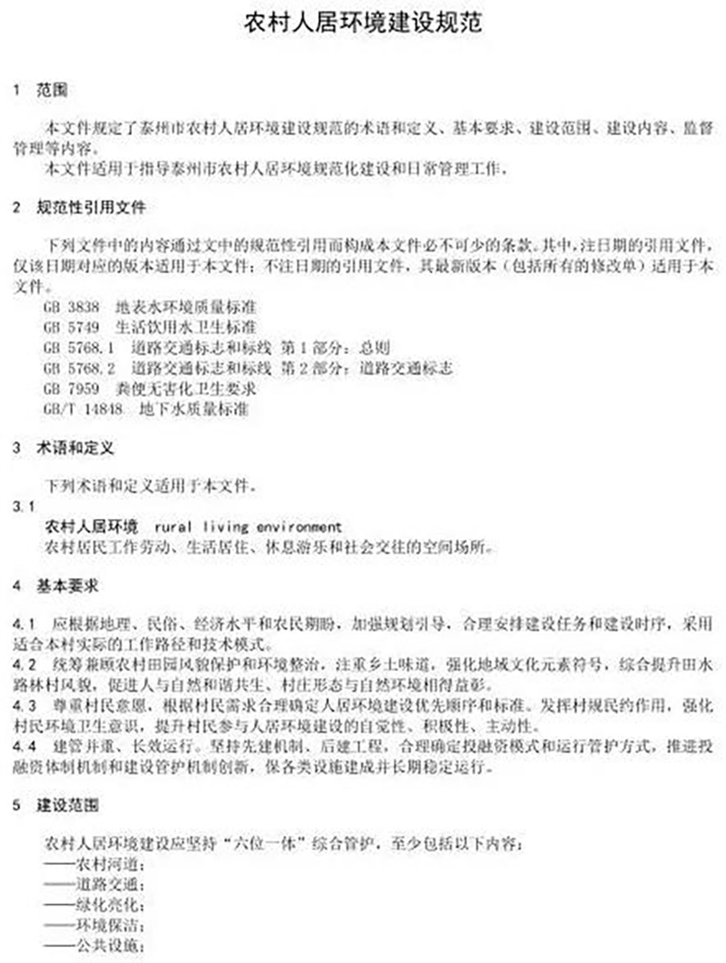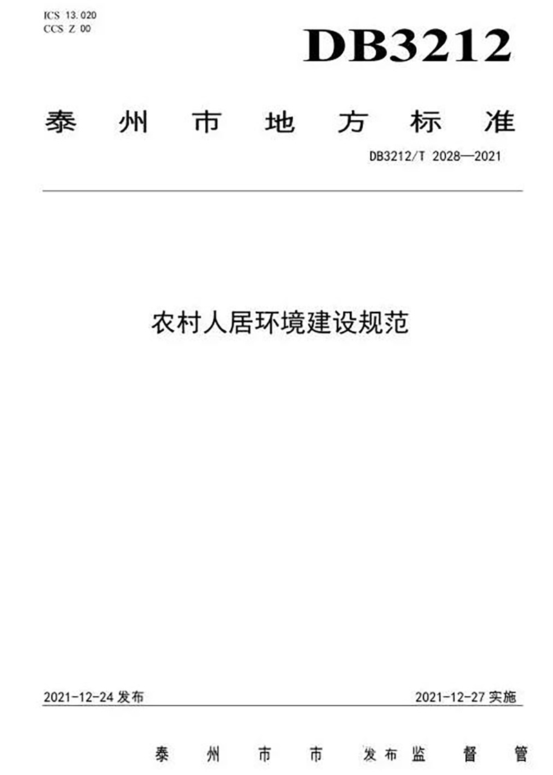 近日,江蘇省泰州市市場監(jiān)督管理局發(fā)布泰州市地方標準《農(nóng)村人居環(huán)境建設(shè)規(guī)范》(DB3212/T2028-2021),該規(guī)范由泰州市農(nóng)業(yè)農(nóng)村局、泰州市標準化院、泰州醫(yī)藥高新區(qū)(高港區(qū))農(nóng)業(yè)農(nóng)村局共同起草,是江蘇省第一個農(nóng)村人居環(huán)境建設(shè)方面的地方性標準,有利于指導農(nóng)村人居環(huán)境規(guī)范化建設(shè)和日常管理工作。