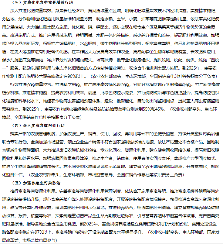 1月25日,生態(tài)環(huán)境部、農(nóng)業(yè)農(nóng)村部、住房和城鄉(xiāng)建設(shè)部、水利部、國家鄉(xiāng)村振興局聯(lián)合發(fā)布《農(nóng)業(yè)農(nóng)村污染治理攻堅戰(zhàn)行動方案(2021—2025年)》的通知。方案指出到2025年,農(nóng)村環(huán)境整治水平顯著提升,農(nóng)業(yè)面源污染得到初步管控,農(nóng)村生態(tài)環(huán)境持續(xù)改善。新增完成8萬個行政村環(huán)境整治,農(nóng)村生活污水治理率達(dá)到40%,基本消除較大面積農(nóng)村黑臭水體;化肥農(nóng)藥使用量持續(xù)減少,主要農(nóng)作物化肥、農(nóng)藥利用率均達(dá)到43%,農(nóng)膜回收率達(dá)到85%;畜禽糞污綜合利用率達(dá)到80%以上。《方案》指出在2021年至2025年農(nóng)業(yè)農(nóng)村污染治理攻堅具有以下任務(wù):(一)加快推進(jìn)農(nóng)村生活污水垃圾治理分區(qū)分類治理生活污水。以解決農(nóng)村生活污水等突出問題為重點(diǎn),提高農(nóng)村環(huán)境整治成效和覆蓋水平。推動縣域農(nóng)村生活污水治理統(tǒng)籌規(guī)劃、建設(shè)和運(yùn)行,與供水、改廁、水系整治、農(nóng)房道路建設(shè)、農(nóng)業(yè)生產(chǎn)、文旅開發(fā)等一體推進(jìn),有效銜接。結(jié)合村莊規(guī)劃,重點(diǎn)治理水源保護(hù)區(qū)和城鄉(xiāng)結(jié)合部、鄉(xiāng)鎮(zhèn)政府駐地、中心村、旅游風(fēng)景區(qū)等人口居住集中區(qū)域農(nóng)村生活污水。2022年6月底前,將縣域農(nóng)村生活污水治理專項規(guī)劃(或方案)向社會公開并按年度實施。按照平原、山地、丘陵、缺水、高寒和生態(tài)環(huán)境敏感等典型地區(qū),分類完善治理模式,科學(xué)合理建設(shè)農(nóng)村生活污水收集和處理設(shè)施。做好戶用污水收集系統(tǒng)和公共污水收集系統(tǒng)的配套銜接,合理選擇排水體制和收集系統(tǒng)建設(shè)方式,確保污水有效收集。在生態(tài)環(huán)境敏感的地區(qū),可采用污水處理標(biāo)準(zhǔn)嚴(yán)格的高級治理模式;在居住較為集中、環(huán)境要求較高的地區(qū),可采用集中處理為主的常規(guī)治理模式;在居住分散、干旱缺水的非環(huán)境敏感區(qū),結(jié)合廁所糞污無害化處理和資源化利用,可采用分散處理為主的簡單治理模式。優(yōu)先推廣運(yùn)行費(fèi)用低、管護(hù)簡便的污水治理技術(shù),鼓勵居住分散地區(qū)采用生態(tài)處理技術(shù),可通過黑灰水分類收集處理、與畜禽糞污協(xié)同治理、建設(shè)人工濕地等方式處理污水,達(dá)到資源化利用要求后,用于庭院美化、村莊綠化等。2023年底前,省級相關(guān)部門篩選建立適合本地區(qū)的農(nóng)村生活污水治理模式和技術(shù)工藝。督促各地完成現(xiàn)有農(nóng)村生活污水收集處理設(shè)施運(yùn)行情況排查,對設(shè)施停運(yùn)破損、管網(wǎng)未配套、處理能力不符合實際需求、出水水質(zhì)不達(dá)標(biāo)等非正常運(yùn)行的設(shè)施制定改造方案,有序完成整改,提高設(shè)施正常運(yùn)行率。到2025年,東部地區(qū)、中西部城市近郊區(qū)等有基礎(chǔ)、有條件的地區(qū),農(nóng)村生活污水治理率達(dá)到55%左右;中西部有較好基礎(chǔ)、基本具備條件的地區(qū),農(nóng)村生活污水治理率達(dá)到25%左右;地處偏遠(yuǎn)、經(jīng)濟(jì)欠發(fā)達(dá)地區(qū),農(nóng)村生活污水治理水平有新提升。(生態(tài)環(huán)境部牽頭,國家發(fā)展改革委、科技部、住房和城鄉(xiāng)建設(shè)部、農(nóng)業(yè)農(nóng)村部、國家鄉(xiāng)村振興局等按職責(zé)分工負(fù)責(zé))加強(qiáng)農(nóng)村改廁與生活污水治理銜接。科學(xué)選擇改廁技術(shù)模式,宜水則水、宜旱則旱。加快研發(fā)干旱、寒冷地區(qū)衛(wèi)生廁所適用技術(shù)和產(chǎn)品。在水沖式廁所改造中積極推廣節(jié)水型、少水型水沖設(shè)施。因地制宜推進(jìn)廁所糞污分散處理、集中處理與納入污水管網(wǎng)統(tǒng)一處理,鼓勵聯(lián)戶、聯(lián)村、村鎮(zhèn)一體處理。已完成水沖式廁所改造的地區(qū),具備污水收集處理條件的,優(yōu)先將廁所糞污納入生活污水收集和處理系統(tǒng);暫時無法納入污水收集處理系統(tǒng)的,應(yīng)建立廁所糞污收集、儲存、資源化利用體系,避免化糞池出水直排。計劃開展水沖式廁所改造的地區(qū),鼓勵將改廁與生活污水治理同步設(shè)計、同步建設(shè)、同步運(yùn)營;暫時無法同步建設(shè)的,預(yù)留后續(xù)污水治理空間。(農(nóng)業(yè)農(nóng)村部、國家鄉(xiāng)村振興局、生態(tài)環(huán)境部、國家衛(wèi)生健康委等按職責(zé)分工負(fù)責(zé))健全農(nóng)村生活垃圾收運(yùn)處置體系。在不便于集中收集處置農(nóng)村生活垃圾的地區(qū),因地制宜采用小型化、分散化的無害化處理方式,降低設(shè)施建設(shè)和運(yùn)行成本。完善日常巡檢機(jī)制,嚴(yán)厲查處在農(nóng)村地區(qū)飲用水水源地周邊、農(nóng)村黑臭水體沿岸隨意傾倒、填埋垃圾行為。到2025年,進(jìn)一步健全農(nóng)村生活垃圾收運(yùn)處置體系。(住房和城鄉(xiāng)建設(shè)部牽頭,農(nóng)業(yè)農(nóng)村部、國家鄉(xiāng)村振興局、生態(tài)環(huán)境部等按職責(zé)分工負(fù)責(zé))推行農(nóng)村生活垃圾分類減量與利用。