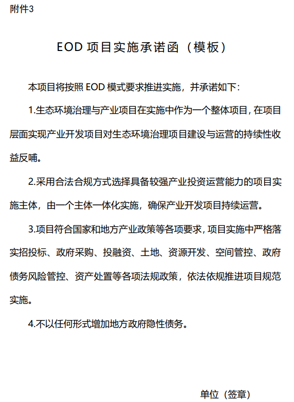 (四)EOD項(xiàng)目應(yīng)一并提交EOD項(xiàng)目實(shí)施方案(編制大綱見(jiàn)附件2)與承諾函(模板見(jiàn)附件3)。承諾函由項(xiàng)目申報(bào)主體和實(shí)施主體(市級(jí)及以下人民政府或園區(qū)管委會(huì))蓋章。