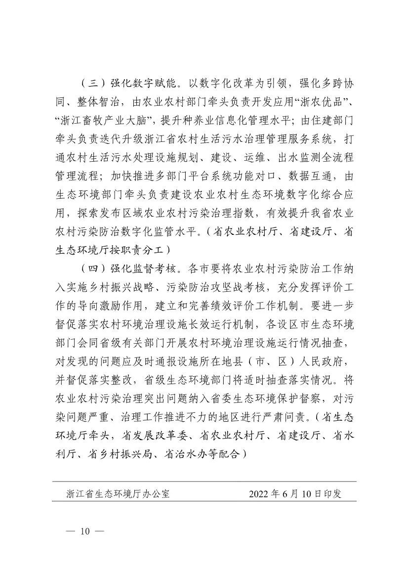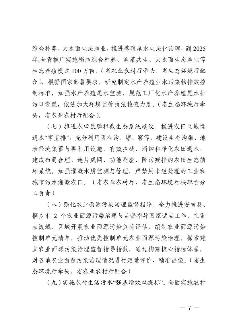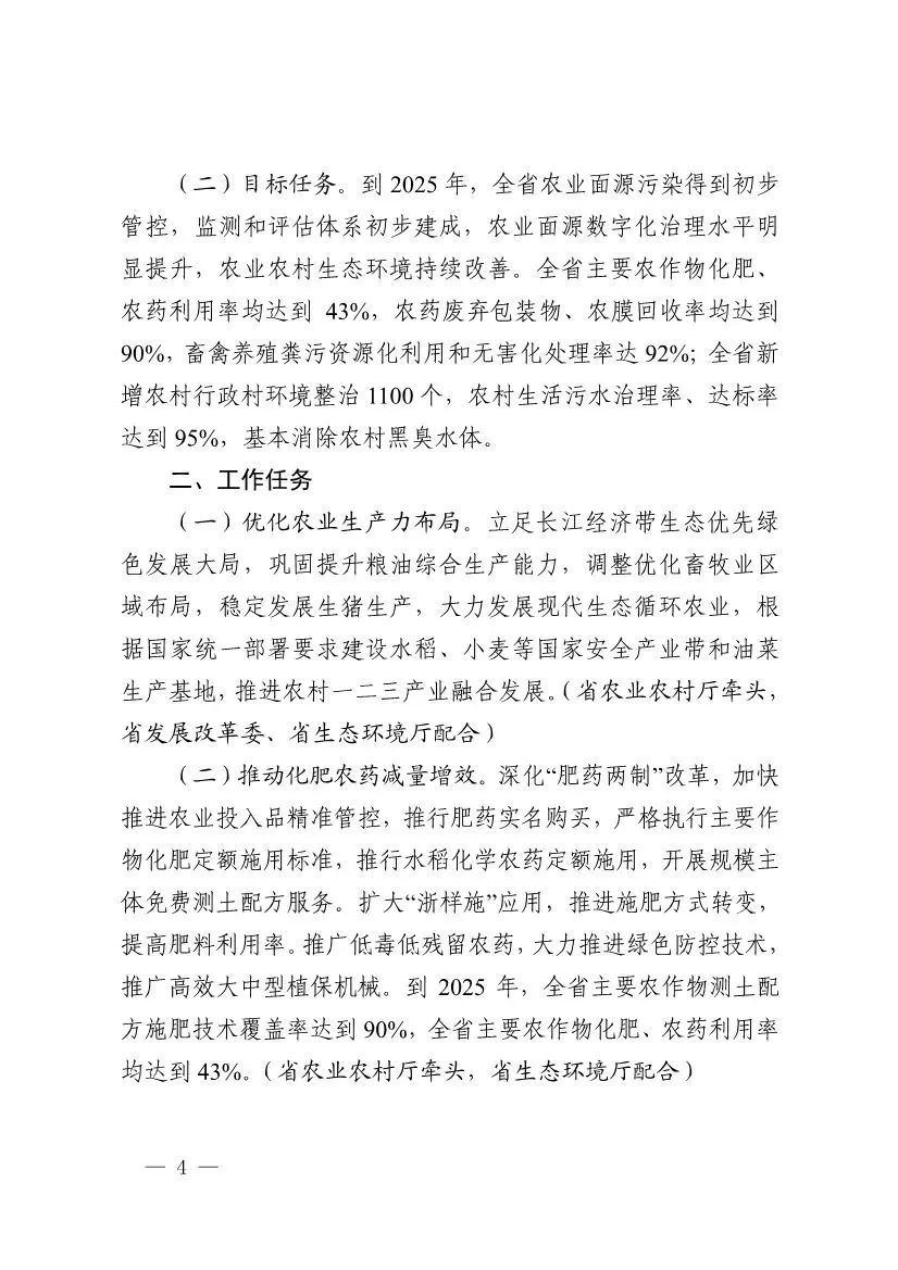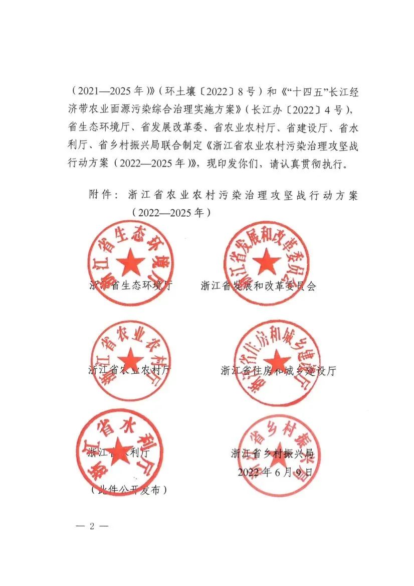 2022年6月9日,浙江省生態(tài)環(huán)境廳、浙江省發(fā)展改革委、浙江省農(nóng)業(yè)農(nóng)村廳等六部門(mén)聯(lián)合印發(fā)《浙江省農(nóng)業(yè)農(nóng)村污染治理攻堅(jiān)戰(zhàn)行動(dòng)方案(2022—2025年)》,要求到2025年,全省農(nóng)業(yè)面源污染得到初步管控,主要農(nóng)作物化肥、農(nóng)藥利用率均達(dá)到43%,農(nóng)藥廢棄包裝物、農(nóng)膜回收率均達(dá)到90%,畜禽養(yǎng)殖糞污資源化利用和無(wú)害化處理率達(dá)92%;全省新增農(nóng)村行政村環(huán)境整治1100個(gè),農(nóng)村生活污水治理率、達(dá)標(biāo)率達(dá)到95%,基本消除農(nóng)村黑臭水體。