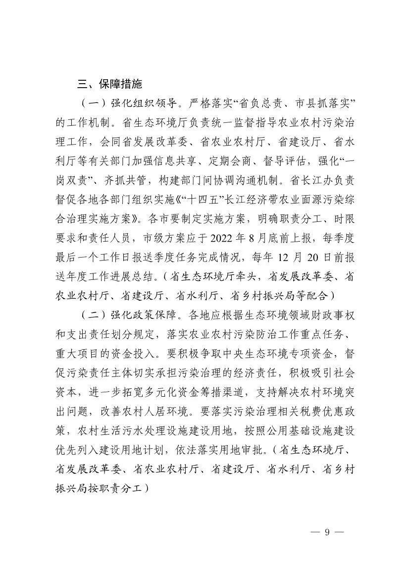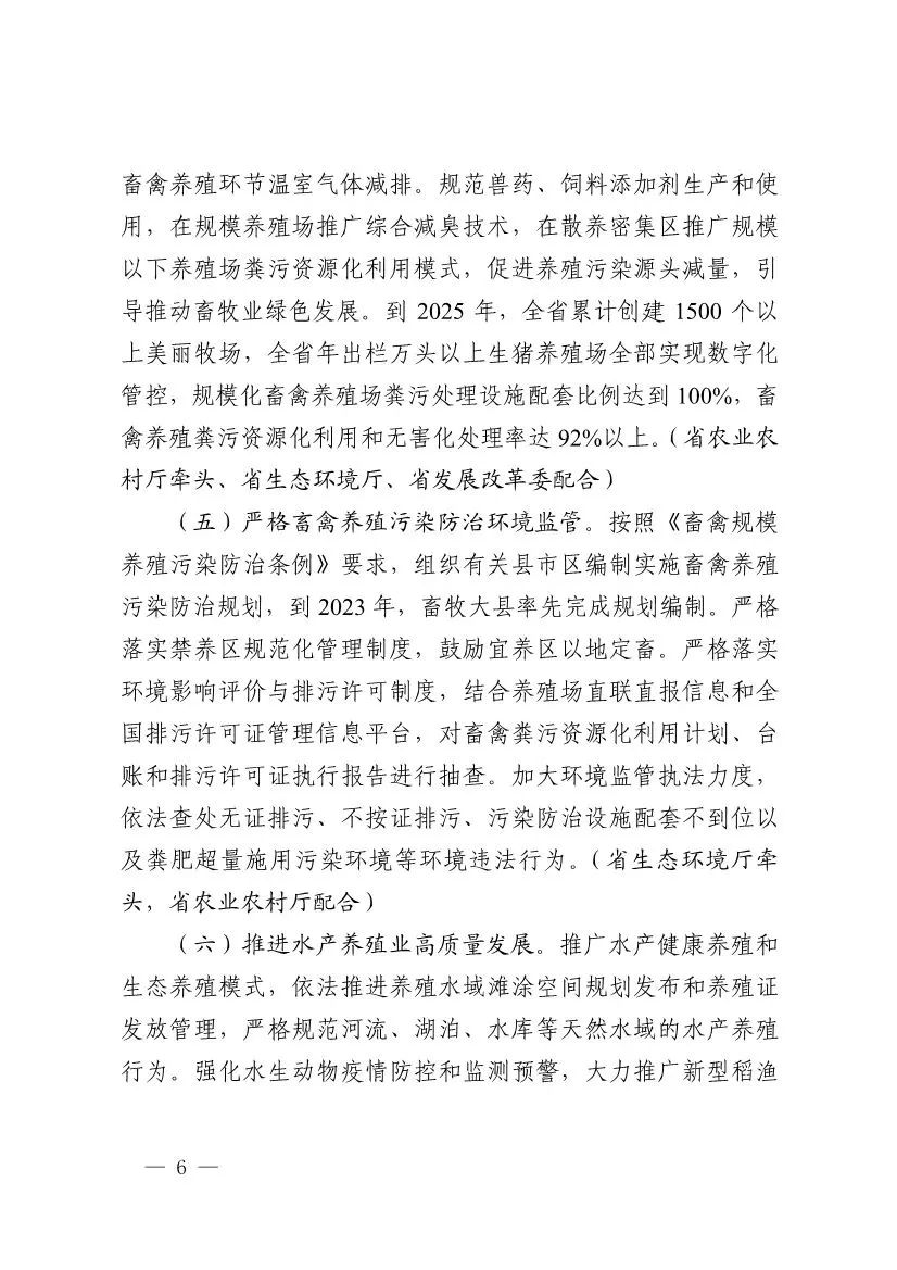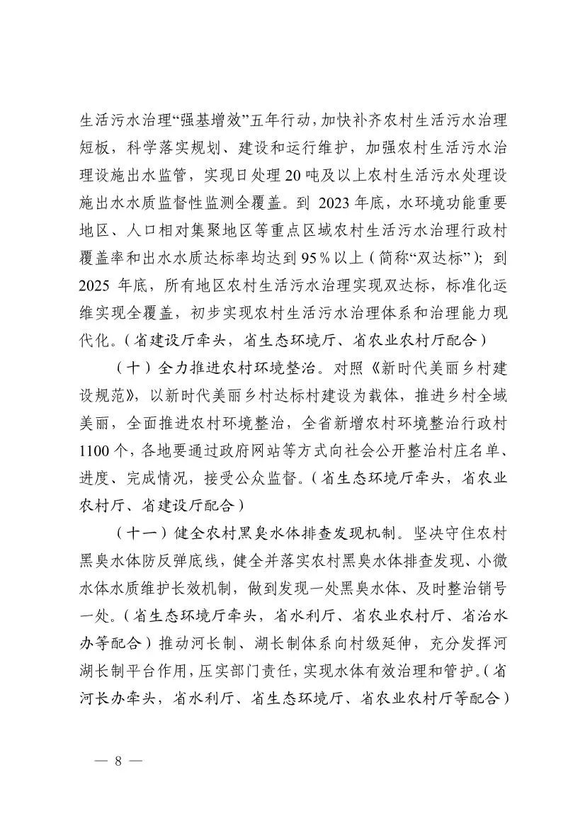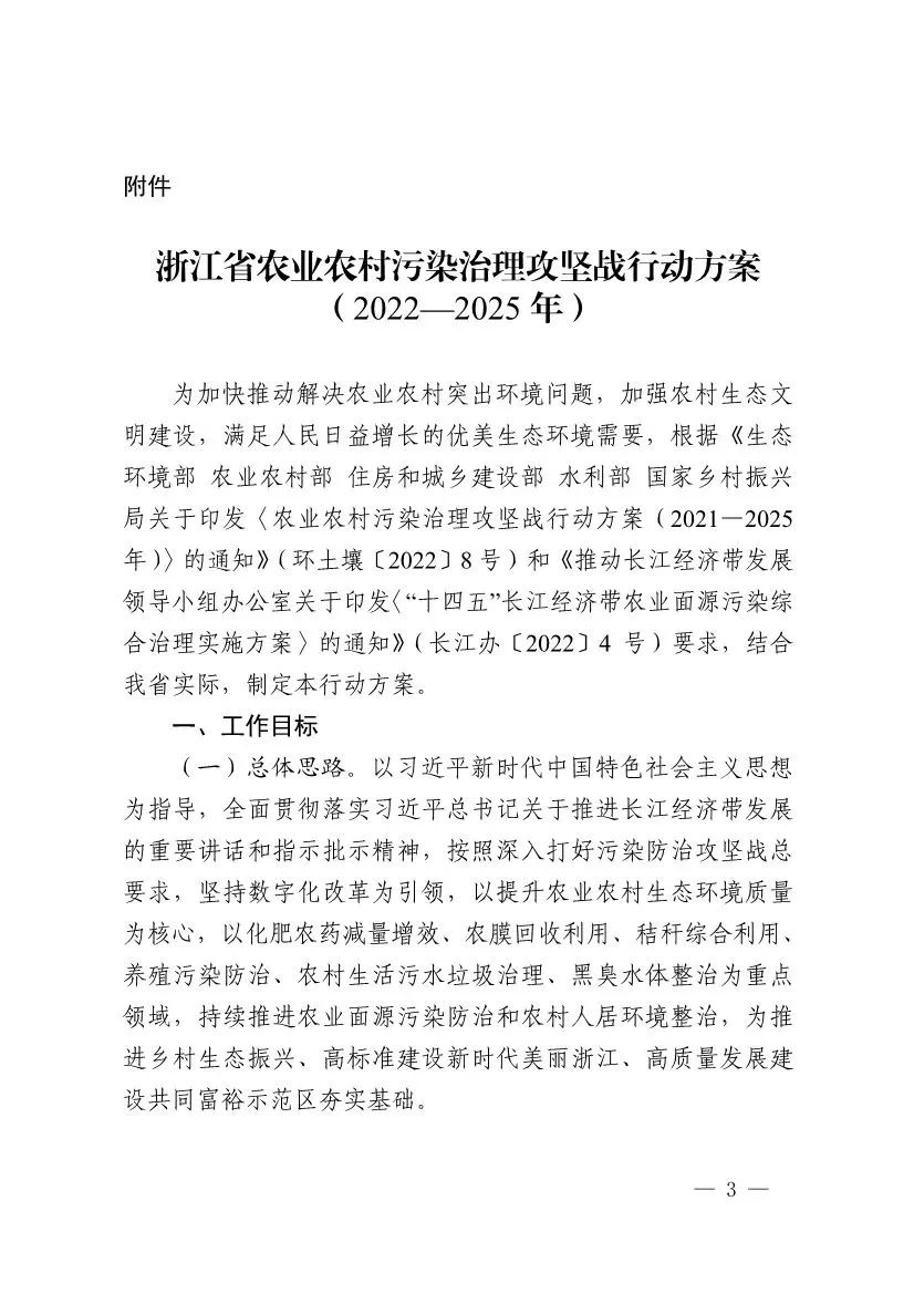 2022年6月9日,浙江省生態(tài)環(huán)境廳、浙江省發(fā)展改革委、浙江省農(nóng)業(yè)農(nóng)村廳等六部門(mén)聯(lián)合印發(fā)《浙江省農(nóng)業(yè)農(nóng)村污染治理攻堅(jiān)戰(zhàn)行動(dòng)方案(2022—2025年)》,要求到2025年,全省農(nóng)業(yè)面源污染得到初步管控,主要農(nóng)作物化肥、農(nóng)藥利用率均達(dá)到43%,農(nóng)藥廢棄包裝物、農(nóng)膜回收率均達(dá)到90%,畜禽養(yǎng)殖糞污資源化利用和無(wú)害化處理率達(dá)92%;全省新增農(nóng)村行政村環(huán)境整治1100個(gè),農(nóng)村生活污水治理率、達(dá)標(biāo)率達(dá)到95%,基本消除農(nóng)村黑臭水體。