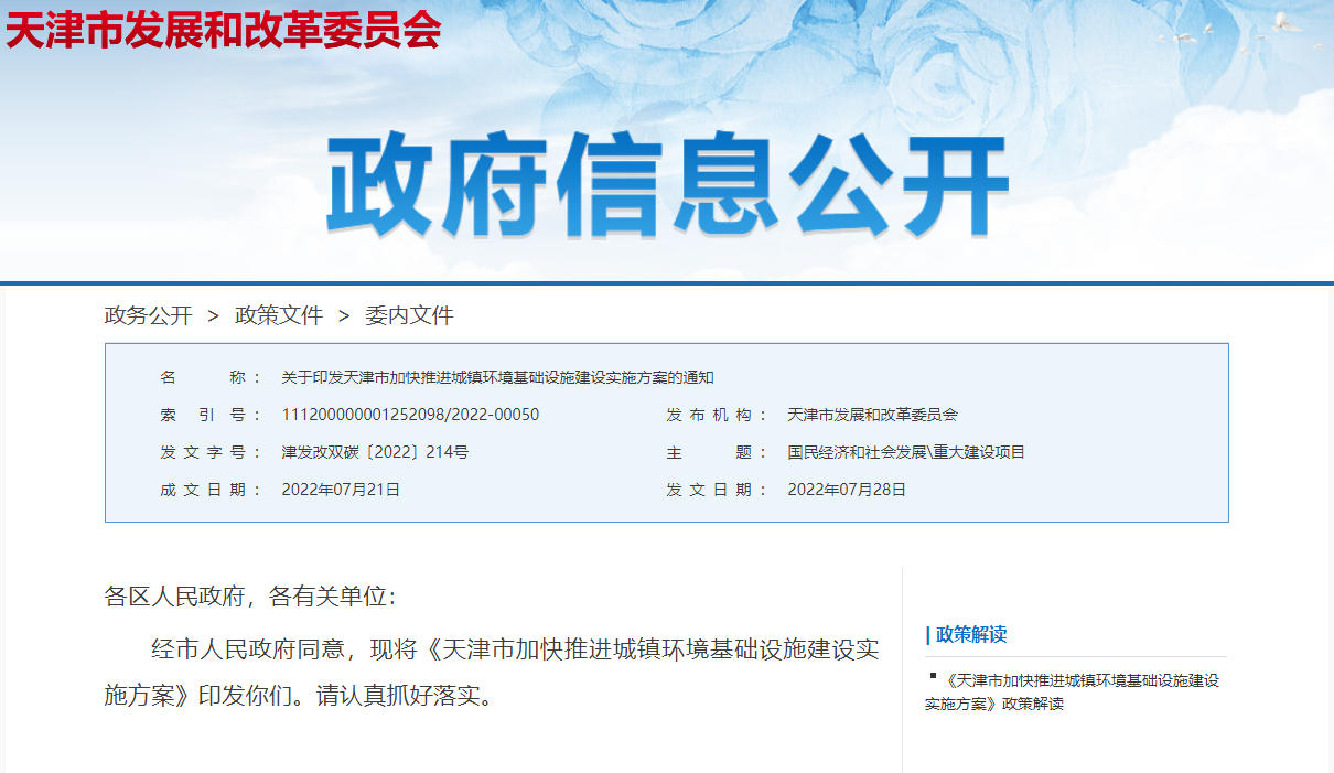 為加快推進本市城鎮(zhèn)環(huán)境基礎(chǔ)設(shè)施建設(shè),提升基礎(chǔ)設(shè)施現(xiàn)代化水平,推動生態(tài)文明建設(shè)和綠色發(fā)展,日前,天津市發(fā)展改革委、市生態(tài)環(huán)境局、市水務(wù)局、市城市管理委、市衛(wèi)生健康委等5個部門共同發(fā)布《天津市加快推進城鎮(zhèn)環(huán)境基礎(chǔ)設(shè)施建設(shè)實施方案》?!斗桨浮?/span>圍繞污水、垃圾、固體廢物、危險廢物、醫(yī)療廢物處理處置,提出我市城鎮(zhèn)環(huán)境基礎(chǔ)設(shè)施建設(shè)的主要目標及具體落實措施。