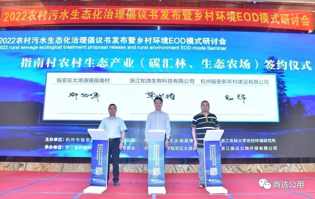 臨安指南村生態(tài)產(chǎn)業(yè)(碳匯林、生態(tài)農(nóng)場)開發(fā)簽約儀式2022年6月,2022農(nóng)村污水生態(tài)化治理倡議書發(fā)布暨鄉(xiāng)村環(huán)境EOD模式研討會在臨安舉行。會議圍繞“農(nóng)村污水生態(tài)化治理”為主旨,更好地推動農(nóng)村污水生態(tài)化治理。會議上舉行了臨安指南村“農(nóng)村污水免費運維”以及生態(tài)產(chǎn)業(yè)(碳匯林、生態(tài)農(nóng)場)開發(fā)簽約儀式。