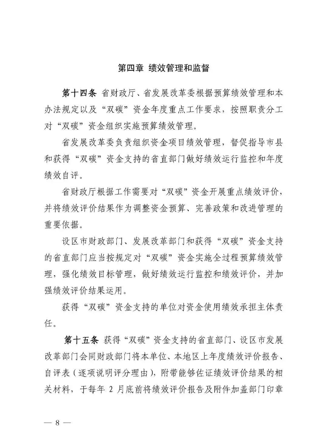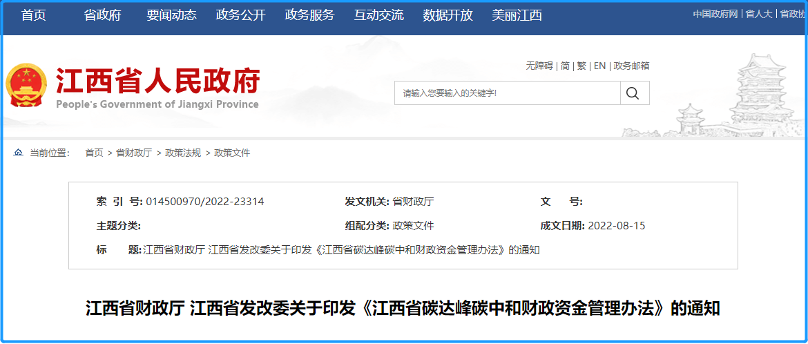 日前,江西省財(cái)政廳、省發(fā)改委印發(fā)《江西省碳達(dá)峰碳中和財(cái)政資金管理辦法》,對(duì)江西省“雙碳”資金的支持范圍和方式、資金申請(qǐng)和使用管理、績(jī)效管理監(jiān)督等作了明確規(guī)定,通過(guò)試點(diǎn)示范、評(píng)價(jià)激勵(lì)等方式,調(diào)動(dòng)各地開展碳達(dá)峰碳中和工作的積極性,進(jìn)一步促進(jìn)經(jīng)濟(jì)社會(huì)綠色低碳發(fā)展。