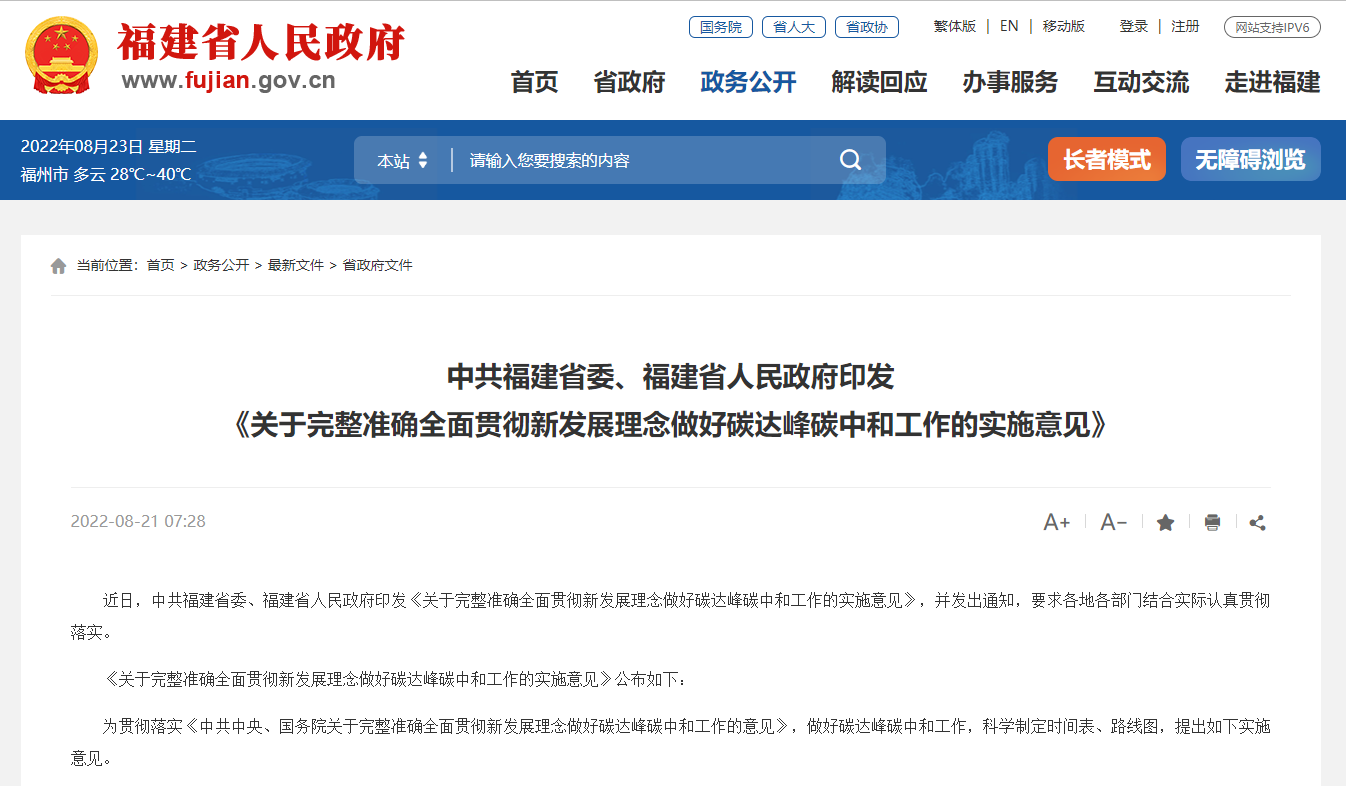 近日,中共福建省委、福建省人民政府印發(fā)《關(guān)于完整準(zhǔn)確全面貫徹新發(fā)展理念做好碳達(dá)峰碳中和工作的實(shí)施意見(jiàn)》,并發(fā)出通知,要求各地各部門(mén)結(jié)合實(shí)際認(rèn)真貫徹落實(shí)。關(guān)于提升城鄉(xiāng)建設(shè)綠色低碳發(fā)展質(zhì)量方面,《實(shí)施意見(jiàn)》指出要結(jié)合推進(jìn)鄉(xiāng)村振興和實(shí)施鄉(xiāng)村建設(shè)行動(dòng),加快推進(jìn)縣城和農(nóng)村綠色低碳發(fā)展。促進(jìn)城鄉(xiāng)建設(shè)和管理模式低碳轉(zhuǎn)型。將綠色低碳要求全面落實(shí)到城鄉(xiāng)規(guī)劃建設(shè)管理各環(huán)節(jié),推動(dòng)建立以綠色低碳為導(dǎo)向的城鄉(xiāng)建設(shè)管理機(jī)制。《關(guān)于完整準(zhǔn)確全面貫徹新發(fā)展理念做好碳達(dá)峰碳中和工作的實(shí)施意見(jiàn)》公布如下:為貫徹落實(shí)《中共中央、國(guó)務(wù)院關(guān)于完整準(zhǔn)確全面貫徹新發(fā)展理念做好碳達(dá)峰碳中和工作的意見(jiàn)》,做好碳達(dá)峰碳中和工作,科學(xué)制定時(shí)間表、路線(xiàn)圖,提出如下實(shí)施意見(jiàn)。一、總體要求以習(xí)近平新時(shí)代中國(guó)特色社會(huì)主義思想為指導(dǎo),全面貫徹黨的十九大和十九屆歷次全會(huì)精神,深入貫徹習(xí)近平生態(tài)文明思想,認(rèn)真貫徹落實(shí)習(xí)近平總書(shū)記來(lái)閩考察重要講話(huà)精神,按照省第十一次黨代會(huì)的部署,立足新發(fā)展階段,完整、準(zhǔn)確、全面貫徹新發(fā)展理念,積極服務(wù)和深度融入新發(fā)展格局,把碳達(dá)峰碳中和納入經(jīng)濟(jì)社會(huì)發(fā)展和生態(tài)省建設(shè)布局,科學(xué)統(tǒng)籌全方位推進(jìn)高質(zhì)量發(fā)展超越和實(shí)現(xiàn)碳達(dá)峰碳中和,堅(jiān)持“全國(guó)統(tǒng)籌、節(jié)約優(yōu)先、雙輪驅(qū)動(dòng)、內(nèi)外暢通、防范風(fēng)險(xiǎn)”原則,以經(jīng)濟(jì)社會(huì)全面綠色轉(zhuǎn)型為引領(lǐng),以能源綠色低碳發(fā)展為關(guān)鍵,深化國(guó)家生態(tài)文明試驗(yàn)區(qū)建設(shè),正確處理好發(fā)展和減排、整體和局部、長(zhǎng)遠(yuǎn)目標(biāo)和短期目標(biāo)、政府和市場(chǎng)的關(guān)系,堅(jiān)定不移走生態(tài)優(yōu)先、綠色低碳的高質(zhì)量發(fā)展道路,奮力譜寫(xiě)全面建設(shè)社會(huì)主義現(xiàn)代化國(guó)家福建篇章。二、主要目標(biāo)到2025年,綠色低碳循環(huán)發(fā)展的經(jīng)濟(jì)體系初步形成,重點(diǎn)行業(yè)能源利用效率大幅提升。單位地區(qū)生產(chǎn)總值能耗和二氧化碳排放下降完成國(guó)家下達(dá)目標(biāo);非化石能源消費(fèi)比重達(dá)到27.40%;森林覆蓋率比2020年增加0.12個(gè)百分點(diǎn),森林蓄積量達(dá)到7.79億立方米,為實(shí)現(xiàn)碳達(dá)峰碳中和奠定堅(jiān)實(shí)基礎(chǔ)。到2030年,經(jīng)濟(jì)社會(huì)發(fā)展綠色低碳轉(zhuǎn)型取得顯著成效,重點(diǎn)耗能行業(yè)能源利用效率達(dá)到國(guó)際先進(jìn)水平。單位地區(qū)生產(chǎn)總值能耗大幅下降;單位地區(qū)生產(chǎn)總值二氧化碳排放比2005年下降65%以上;非化石能源消費(fèi)比重達(dá)到30%以上,風(fēng)電、太陽(yáng)能發(fā)電總裝機(jī)容量達(dá)到2000萬(wàn)千瓦以上;森林覆蓋率比2020年增加0.19個(gè)百分點(diǎn),森林蓄積量達(dá)到8億立方米,二氧化碳排放量達(dá)到峰值并實(shí)現(xiàn)穩(wěn)中有降。到2060年,綠色低碳循環(huán)發(fā)展的經(jīng)濟(jì)體系和清潔低碳安全高效的能源體系全面建立,能源利用效率達(dá)到國(guó)際先進(jìn)水平,非化石能源消費(fèi)比重達(dá)到80%以上,碳中和目標(biāo)順利實(shí)現(xiàn),生態(tài)文明建設(shè)取得豐碩成果,開(kāi)創(chuàng)人與自然和諧共生新境界。三、推進(jìn)經(jīng)濟(jì)社會(huì)發(fā)展全面綠色轉(zhuǎn)型(一)強(qiáng)化綠色低碳發(fā)展規(guī)劃引領(lǐng)。強(qiáng)化戰(zhàn)略導(dǎo)向,將碳達(dá)峰碳中和目標(biāo)要求全面融入全省經(jīng)濟(jì)社會(huì)發(fā)展中長(zhǎng)期規(guī)劃和生態(tài)省規(guī)劃,加強(qiáng)省級(jí)發(fā)展規(guī)劃、國(guó)土空間規(guī)劃、專(zhuān)項(xiàng)規(guī)劃、區(qū)域規(guī)劃和市縣級(jí)規(guī)劃等各級(jí)各類(lèi)規(guī)劃的銜接,強(qiáng)化支撐保障,確保碳達(dá)峰碳中和主要目標(biāo)、發(fā)展方向、重大政策、重大工程等協(xié)調(diào)一致。(二)構(gòu)建綠色低碳國(guó)土空間格局。構(gòu)建全省統(tǒng)一的國(guó)土空間規(guī)劃體系,強(qiáng)化國(guó)土空間用途管控,嚴(yán)格保護(hù)森林、草地、濕地、海洋、土壤等具有重要固碳功能的自然生態(tài)系統(tǒng)。堅(jiān)持綠色低碳、因地制宜,強(qiáng)化底線(xiàn)約束,統(tǒng)籌布局農(nóng)業(yè)、生態(tài)、城鎮(zhèn)等功能空間。遵循山水林田湖草沙生命共同體理念,保護(hù)城市山水格局,構(gòu)筑生態(tài)廊道,保護(hù)生態(tài)屏障,提高國(guó)土安全性和城市韌性。(三)全面推進(jìn)重點(diǎn)區(qū)域低碳發(fā)展。在推進(jìn)福州都市圈、廈漳泉都市圈等建設(shè)過(guò)程中,深入落實(shí)綠色低碳發(fā)展導(dǎo)向和任務(wù)要求,發(fā)揮地區(qū)產(chǎn)業(yè)協(xié)