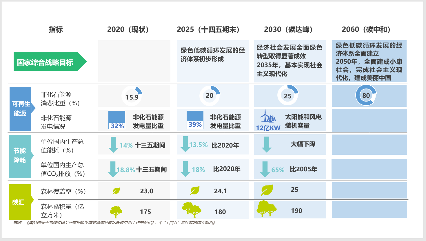 2021年10月,中國向聯(lián)合國提交了最新的國家自主貢獻(xiàn)(NDC)和長期排放控制戰(zhàn)略。根據(jù)中國最新的NDC,除了延續(xù)2015年提出的2030碳達(dá)峰目標(biāo),中國進(jìn)一步強(qiáng)調(diào)了在2060年實現(xiàn)碳中和的承諾。此次國家自主貢獻(xiàn)還把2030年碳排放強(qiáng)度減排目標(biāo)(以2005年為基準(zhǔn))從原來60%-65%提高到65%以上,雙碳目標(biāo)已經(jīng)納入國家總體發(fā)展戰(zhàn)略。