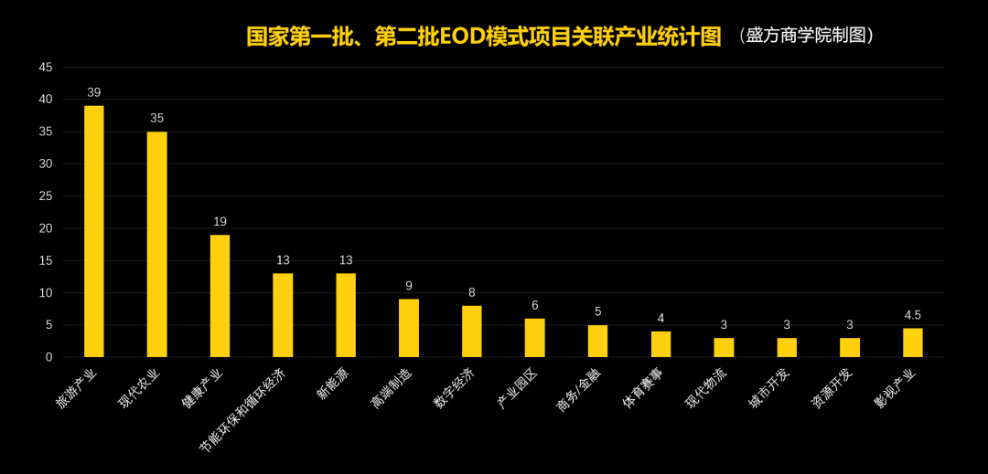 ③關(guān)聯(lián)產(chǎn)業(yè)2021年生態(tài)環(huán)境部發(fā)布的《一圖讀懂EOD模式與試點(diǎn)實(shí)踐》中,對(duì)EOD項(xiàng)目的產(chǎn)業(yè)選擇原則進(jìn)行描述,強(qiáng)調(diào)“發(fā)展契合當(dāng)?shù)厣鐣?huì)經(jīng)濟(jì)發(fā)展實(shí)際、生態(tài)環(huán)境關(guān)聯(lián)度高、項(xiàng)目收益能力強(qiáng)的產(chǎn)業(yè)”。小編為大家梳理第一批、第二批國(guó)家EOD試點(diǎn)項(xiàng)目的關(guān)聯(lián)產(chǎn)業(yè),其中旅游產(chǎn)業(yè)、現(xiàn)代農(nóng)業(yè)和健康產(chǎn)業(yè)位居前三。