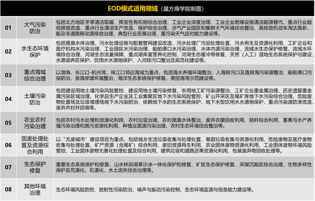 2022年發(fā)布的《生態(tài)環(huán)保金融支持項(xiàng)目?jī)?chǔ)備庫(kù)入庫(kù)指南(試行)》(環(huán)辦科財(cái)〔2022〕6號(hào))文件中,EOD入庫(kù)項(xiàng)目應(yīng)屬于以下8大領(lǐng)域: