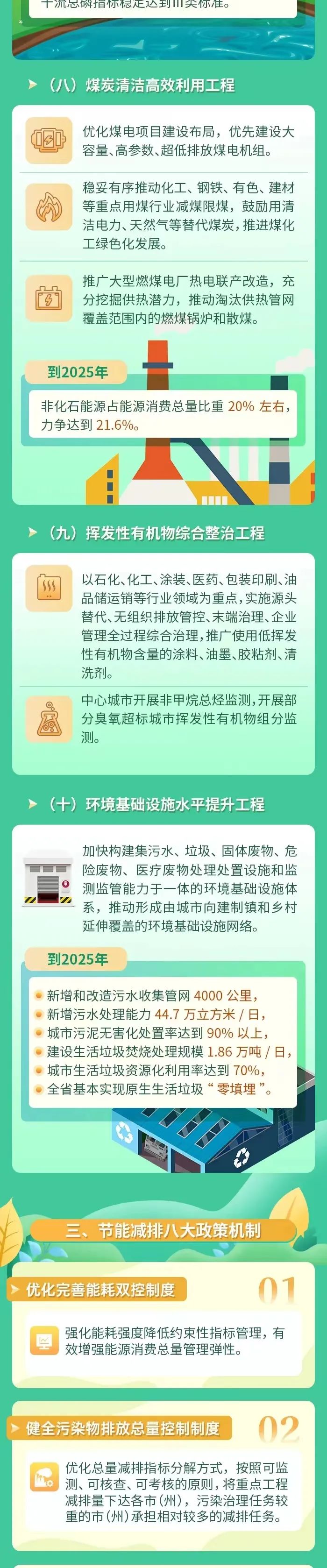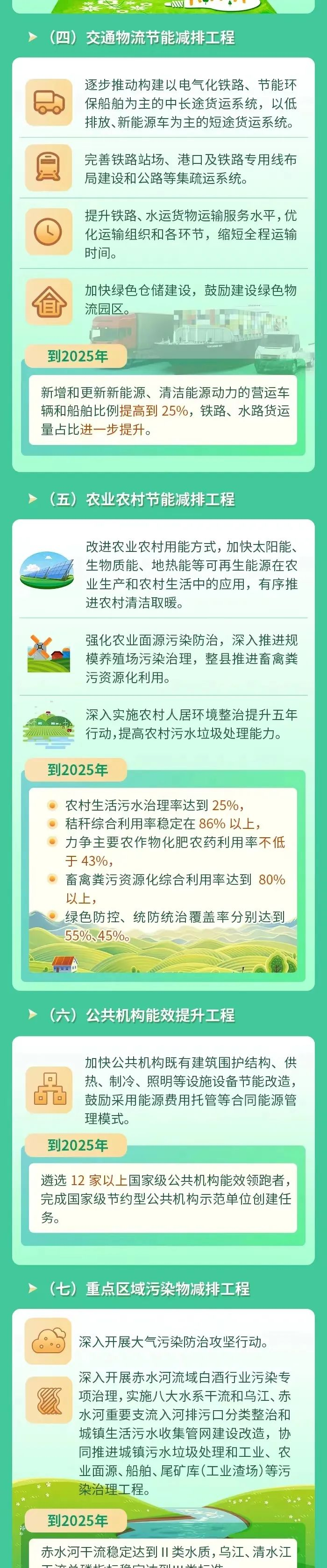 《方案》在農(nóng)業(yè)農(nóng)村節(jié)能減排工程方面指出:改進(jìn)農(nóng)業(yè)農(nóng)村用能方式,引導(dǎo)農(nóng)村不斷減少低質(zhì)燃煤、秸稈、薪柴直接燃燒等傳統(tǒng)能源使用,加快太陽能、生物質(zhì)能、地?zé)崮艿瓤稍偕茉丛谵r(nóng)業(yè)生產(chǎn)和農(nóng)村生活中的應(yīng)用,有序推進(jìn)農(nóng)村清潔取暖。推廣應(yīng)用節(jié)能環(huán)保灶具、農(nóng)用電動(dòng)車輛、節(jié)能環(huán)保農(nóng)機(jī)和漁船,發(fā)展節(jié)能低碳農(nóng)業(yè)大棚,推進(jìn)農(nóng)房節(jié)能改造和綠色農(nóng)房建設(shè)。強(qiáng)化農(nóng)業(yè)面源污染防治,推進(jìn)農(nóng)藥化肥減量增效、農(nóng)林廢棄物綜合利用,加大廢舊農(nóng)膜和農(nóng)藥包裝廢棄物回收處理力度。深入推進(jìn)規(guī)模養(yǎng)殖場污染治理,整縣推進(jìn)畜禽糞污資源化利用。深入實(shí)施農(nóng)村人居環(huán)境整治提升五年行動(dòng),提高農(nóng)村污水垃圾處理能力,基本消除較大面積的農(nóng)村黑臭水體。到2025年,農(nóng)村生活污水治理率達(dá)到25%,秸稈綜合利用率穩(wěn)定在86%以上,力爭主要農(nóng)作物化肥農(nóng)藥利用率不低于43%,畜禽糞污資源化綜合利用率達(dá)到80%以上,綠色防控、統(tǒng)防統(tǒng)治覆蓋率分別達(dá)到55%、45%。