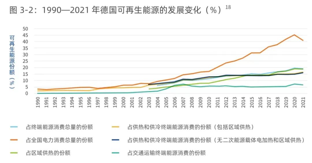 德國是全球能源轉(zhuǎn)型的先驅(qū)之一,也是能源結(jié)構(gòu)較好的國家。2021年,德國可再生能源占終端能源消費總量的19.2%,占終端電力消費總量的41.1%(2021年是"小風年"),占區(qū)域供熱的18.8%,占供熱和供冷的16.5%(包括區(qū)域供熱),占終端交通運輸消費總量的6.8%。德國的目標是:在2030年之前實現(xiàn)可再生能源供給滿足80%的電力需求和50%的熱力需求。