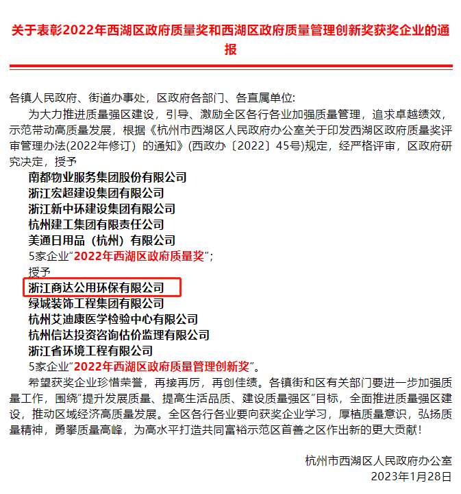 近日,杭州市西湖區(qū)人民政府發(fā)布“關(guān)于表彰2022年西湖區(qū)政府質(zhì)量獎(jiǎng)和西湖區(qū)政府質(zhì)量管理創(chuàng)新獎(jiǎng)獲獎(jiǎng)企業(yè)”的通報(bào),商達(dá)公用榮獲“2022年西湖區(qū)政府質(zhì)量管理創(chuàng)新獎(jiǎng)”。