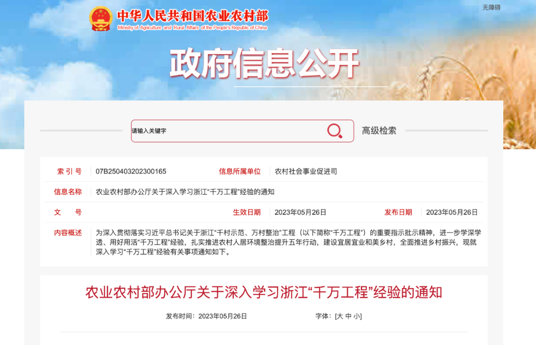 為深入貫徹落實(shí)習(xí)近平總書記關(guān)于浙江“千村示范、萬(wàn)村整治”工程(以下簡(jiǎn)稱“千萬(wàn)工程”)的重要指示批示精神,進(jìn)一步學(xué)深學(xué)透、用好用活“千萬(wàn)工程”經(jīng)驗(yàn),扎實(shí)推進(jìn)農(nóng)村人居環(huán)境整治提升五年行動(dòng),建設(shè)宜居宜業(yè)和美鄉(xiāng)村,全面推進(jìn)鄉(xiāng)村振興,現(xiàn)就深入學(xué)習(xí)“千萬(wàn)工程”經(jīng)驗(yàn)有關(guān)事項(xiàng)通知如下。