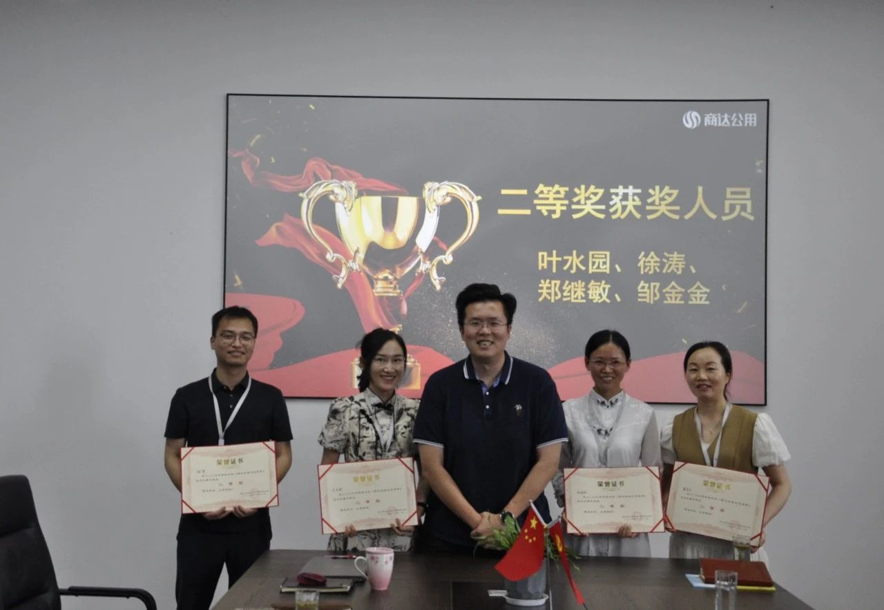 二等獎(jiǎng)獲獎(jiǎng)人員為總經(jīng)辦葉水園、設(shè)計(jì)研究院徐濤、財(cái)務(wù)中心鄭繼敏和管理中心鄒金金,商達(dá)公用董事長(zhǎng)助理張毅為其頒獎(jiǎng)。