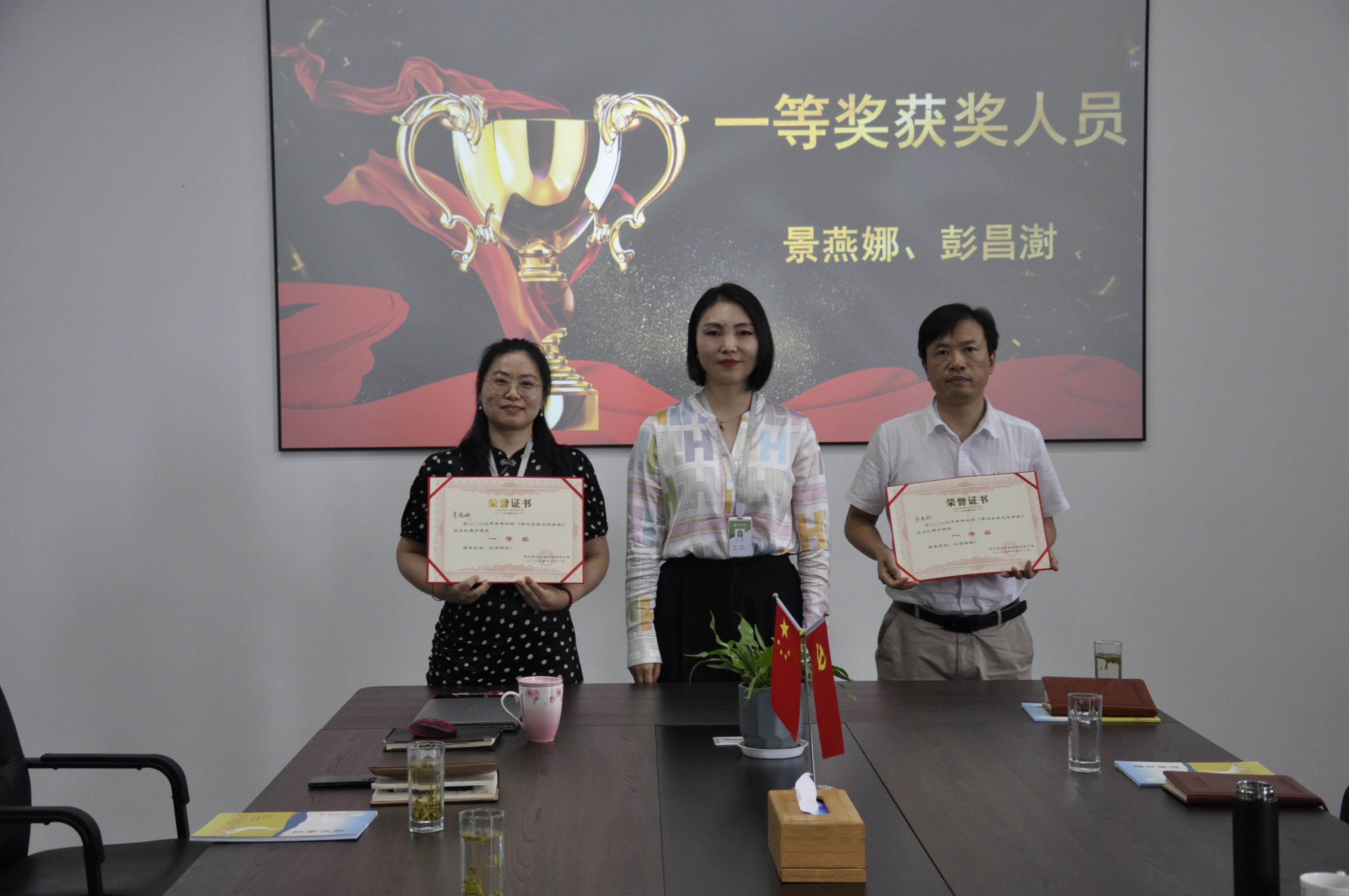 一等獎(jiǎng)獲獎(jiǎng)人員為管理中心彭昌澍與管理中心景燕娜,商達(dá)公用總經(jīng)理潘碧文為其頒獎(jiǎng)。
