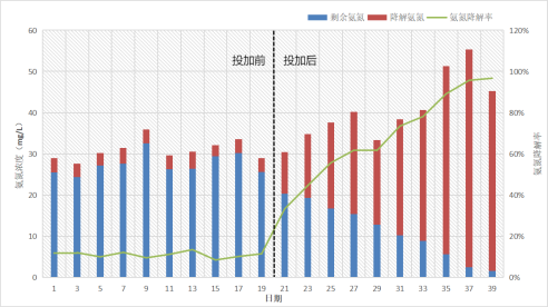 根據(jù)在山東濟寧進行的原位對比試驗,在投加低溫功能菌之前,由于收到低溫的影響氨氮和總氮去除率僅在8-20%之間徘徊;而在投加低溫功能菌之后,總氮去除率在20天后就躍升至70%,而氨氮的去除率更是攀升至90%左右,出水達到一級A標準。該成果的取得極大地增強了公司在北方農污市場的核心競爭力,同時為確?,F(xiàn)有工程的順利實施提供了技術保障。該成果已于2023年8月21日順利通過專家鑒定。