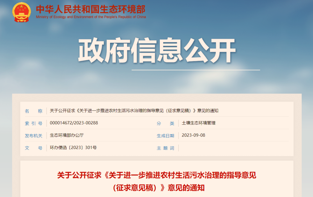 關于公開征求《關于進一步推進農村生活污水治理的指導意見(征求意見稿)》意見的通知