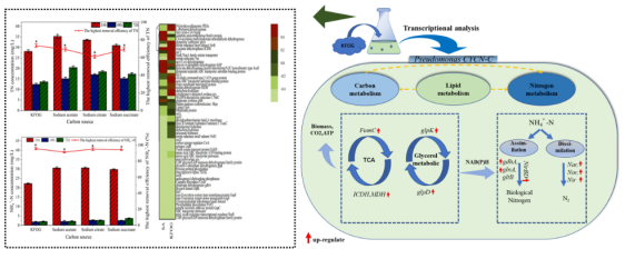 針對上述問題,研究團隊分離并鑒定了一株具有油脂利用和高效脫氮能力的假單胞菌CYCN-C。菌株CYCN-C以KFOG為唯一碳源,TN的去除率可以達到73.5%。并且利用轉(zhuǎn)錄組技術分析了菌株CYCN-C分別以KFOG和乙酸鈉為碳源時的基因表達情況。結果顯示,KFOG組中部分基因表達水平顯著升高,其中包括參與碳代謝的細胞色素o泛醇氧化酶(cyo)、碳儲存調(diào)節(jié)蛋白基因(CsrA)、聚羥基烷酸酯(PHAs)和延胡索酸酶(FumC)基因分別上調(diào)6.9倍、0.7倍、26.0倍和19.0倍,參與氮代謝的硝酸還原酶(nar)和亞硝酸鹽還原酶(nirB、nirD)基因分別上調(diào)115倍、30倍和49倍,參與脂質(zhì)代謝途徑的脂肪酶(lipA、lipB)、甘油-3-磷酸脫氫酶(glpD)和甘油激酶(glpK)基因分別上調(diào)0.6倍、0.4倍、21.5倍和1.3倍。本研究驗證了廢棄油脂作為碳源的可行性,并為該細菌利用廢棄油脂和脫氮的代謝機制提供了新的見解。