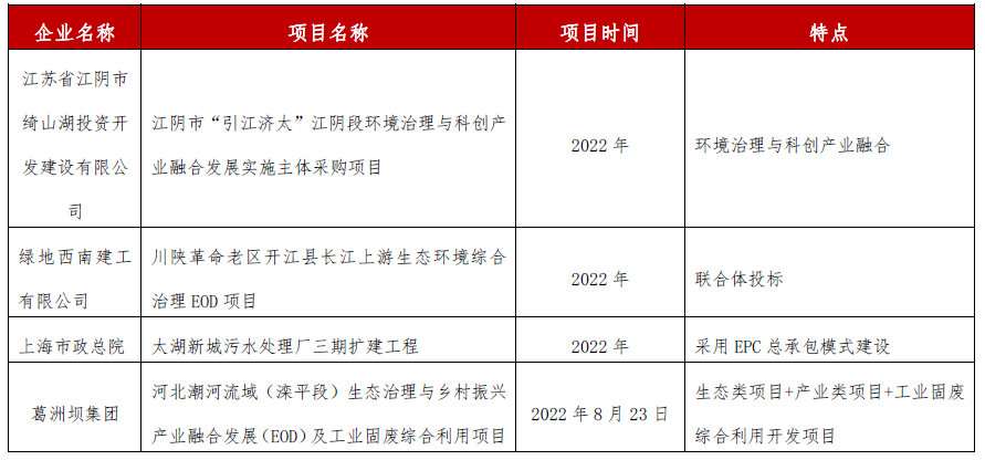 2023年3月江蘇省生態(tài)環(huán)境廳、江蘇省發(fā)展改革委和江蘇省財政廳聯(lián)合印發(fā)《江蘇省生態(tài)環(huán)境導(dǎo)向開發(fā)模式(EOD)實施工作方案(試行)》,提出“十四五”期間,力爭在全省范圍內(nèi)建設(shè)省級EOD試點項目40個,自2023年起新增15個試點項目納入國家生態(tài)環(huán)保金融支持項目儲備庫。