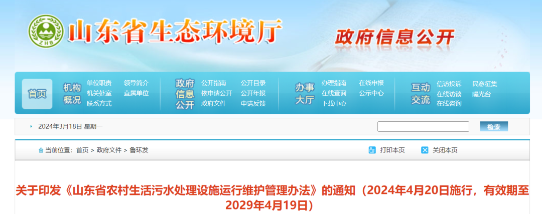關(guān)于印發(fā)《山東省農(nóng)村生活污水處理設(shè)施運行維護管理辦法》的通知(2024年4月20日施行,有效期至2029年4月19日)