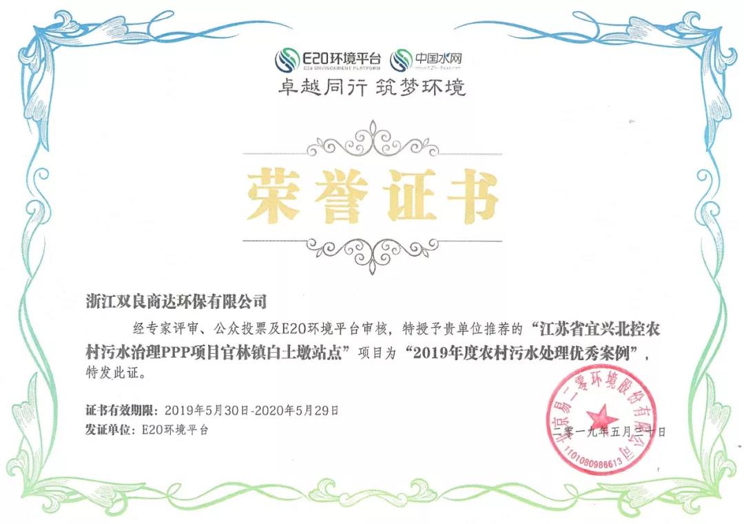 2019年5月,在2019(第五屆)環(huán)境施治論壇上,由雙良商達(dá)建設(shè)并運(yùn)維的“江蘇省宜興北控農(nóng)村污水治理PPP項(xiàng)目官林鎮(zhèn)白土墩站點(diǎn)”被評(píng)為“2019年度農(nóng)村污水處理優(yōu)秀案例”。