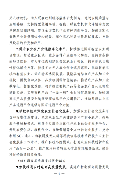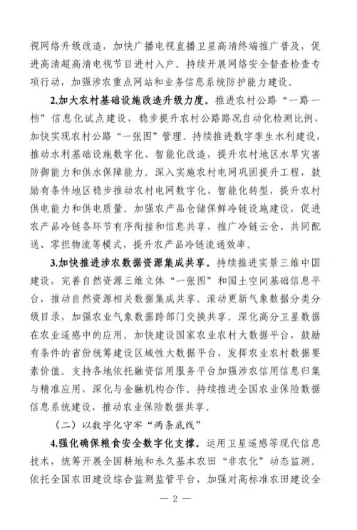 《工作要點》部署了9個方面28項重點任務(wù)。一是筑牢數(shù)字鄉(xiāng)村發(fā)展底座。包括提升農(nóng)村網(wǎng)絡(luò)基礎(chǔ)設(shè)施供給能力,加大農(nóng)村基礎(chǔ)設(shè)施改造升級力度,加快推進涉農(nóng)數(shù)據(jù)資源集成共享。二是以數(shù)字化守牢“兩條底線”。包括強化確保糧食安全數(shù)字化支撐,強化防止返貧監(jiān)測和幫扶舉措。三是大力推進智慧農(nóng)業(yè)發(fā)展。包括加強農(nóng)業(yè)科技創(chuàng)新與應(yīng)用推廣,提升農(nóng)業(yè)全產(chǎn)業(yè)鏈數(shù)字化水平,以數(shù)字技術(shù)深化農(nóng)業(yè)社會化服務(wù)。四是激發(fā)縣域數(shù)字經(jīng)濟新活力。包括加快推進農(nóng)村電商高質(zhì)量發(fā)展,多措并舉推動農(nóng)文旅融合發(fā)展,釋放涉農(nóng)數(shù)據(jù)要素乘數(shù)效應(yīng),運用數(shù)字技術(shù)促進農(nóng)民增收。五是推動鄉(xiāng)村數(shù)字文化振興。包括加快鄉(xiāng)村文化文物資源數(shù)字化,豐富鄉(xiāng)村公共文化服務(wù)數(shù)字供給。六是健全鄉(xiāng)村數(shù)字治理體系。包括穩(wěn)步推進農(nóng)村“三務(wù)”信息化建設(shè),提升農(nóng)村社會治理數(shù)字化效能,增強農(nóng)村智慧應(yīng)急管理能力。七是深化鄉(xiāng)村數(shù)字普惠服務(wù)。包括著力提升鄉(xiāng)村教育數(shù)字化水平,持續(xù)推進鄉(xiāng)村數(shù)字健康發(fā)展,增強農(nóng)村數(shù)字普惠金融服務(wù)實效,加強農(nóng)村特殊人群信息服務(wù)保障。八是加快建設(shè)智慧美麗鄉(xiāng)村。包括加強農(nóng)村人居環(huán)境整治數(shù)字化應(yīng)用,提升農(nóng)村生態(tài)環(huán)境保護監(jiān)管效能。九是統(tǒng)籌推進數(shù)字鄉(xiāng)村建設(shè)。包括加強跨部門跨層級協(xié)調(diào)聯(lián)動,健全多元化投入保障機制,培養(yǎng)壯大鄉(xiāng)村數(shù)字人才隊伍,推進重點領(lǐng)域標準化建設(shè),講好新時代數(shù)字鄉(xiāng)村故事。