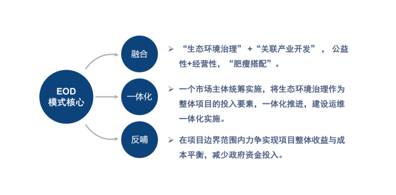 EOD(Ecology - Oriented Development)即生態(tài)環(huán)境導(dǎo)向的開發(fā)模式,是以生態(tài)保護(hù)和環(huán)境治理為基礎(chǔ),以特色產(chǎn)業(yè)運(yùn)營為支撐,以區(qū)域綜合開發(fā)為載體,采取產(chǎn)業(yè)鏈延伸、聯(lián)合經(jīng)營、組合開發(fā)等方式,推動(dòng)公益性較強(qiáng)、收益性差的生態(tài)環(huán)境治理項(xiàng)目與收益較好的關(guān)聯(lián)產(chǎn)業(yè)有效融合。